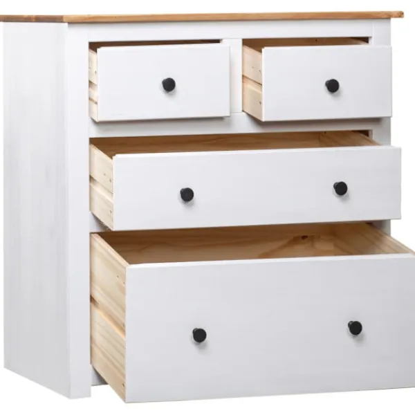 Tack vare skänkens 4 lådor kan du förvara dina tidskrifter, böcker, DVD:er och mediaenheter organiserat och inom räckhåll. Dess robusta ovansida är en perfekt plats att ställa dekorativa föremål som vaser eller krukväxter. Skåpet är tillverkat i massiv furu. Varje steg i processen utförs med största omsorg, vare sig det är polering, målning eller lackering. Det skickliga hantverket och de vackra träådringarna gör varje möbel unik och något olik alla andra.