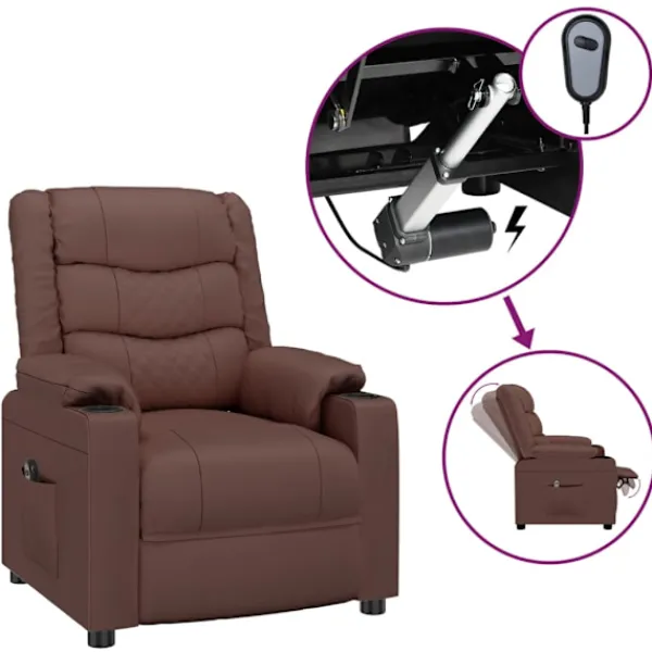 Luta dig tillbaka och koppla av i den här mycket bekväma reclinerfåtölj! Elektrisk justering : Denna vilofåtölj är utrustad med en elektrisk motor för justering av ryggstöd och fotstöd. Den har 3 justerbara lägen, vilket gör att du enkelt kan justera ryggstödet och fotstödet med den medföljande handkontrollen med två knappar enligt din komfort.Bekväm sittupplevelse: Det tjockt vadderade sätet, ryggstödet och de breda armstöden täckta i konstläder ger en mysig och varm känsla, vilket gör att du känner dig omfamnad när du sitter. Konstläder är ett högst slitstarkt material. Den är fläckbeständig, vilket gör den enkel att rengöra med en fuktig trasa. Den släta ytan har också ett lyxigt utseende.Massiv och stabil ram: Ramen av trä och metall bidrar till en stark och stabil konstruktion. Denna fällbara fåtölj är bekväm och hållbar.
