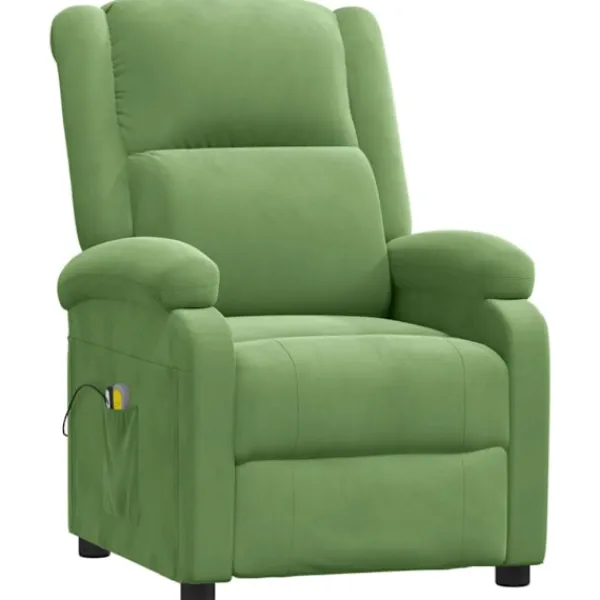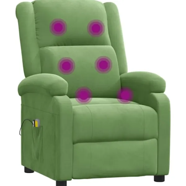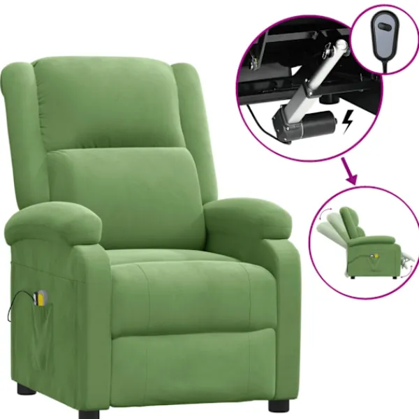 Luta dig tillbaka och koppla av i denna mycket bekväma massagefåtölj! Elektrisk justering : Denna vilofåtölj är utrustad med en elektrisk motor för justering av ryggstöd och fotstöd. Den har 3 justerbara lägen, vilket gör att du enkelt kan justera ryggstödet och fotstödet med den medföljande handkontrollen med två knappar enligt din komfort.Vibration: De 6 massagepunkterna låter dig uppleva en bättre riktad massage. Kontrollen låter dig välja olika massageprogram. Massagefunktionen drivs av USB-kontakten, men den certifierade 5V USB-strömkällan ingår inte.Bekväm sittupplevelse: Det tjockt vadderade sätet, ryggstödet och de breda armstöden klädda i sammet bidrar till en mysig och varm känsla, vilket gör att du känner dig omfamnad när du sitter. Sammet är ett mjukt och skönt tyg som känns skönt mot huden.Massiv och stabil ram: Ramen av trä och metall bidrar till en stark och stabil konstruktion. Denna fällbara fåtölj är bekväm och hållbar.