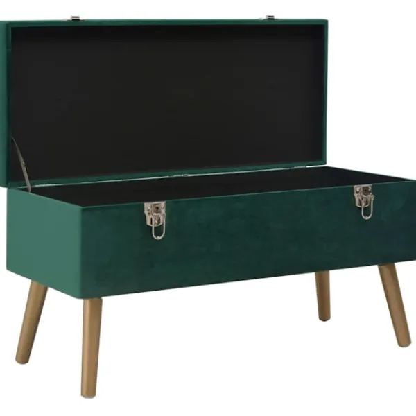 Denna bänk i sammet blir garanterat ett blickfång i vardagsrummet, hallen eller salongen. Den gröna sammetsklädseln är mjuk och mycket mysig samtidigt som den ger din inredning en färgglad detalj. Den har ett inbyggt förvaringsutrymme med extra plats för att förvara dina prylar. De guldmålade träbenen bidrar dessutom till hallbänkens stabilitet och hållbarhet. Bänken blir en elegant dekoration i din inredning och en oumbärlig del av rummet.