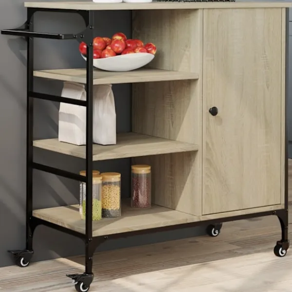 - Gott om förvaringsutrymme: Denna grönsaksvagn har gott om förvaringsutrymme för att hålla mat, skålar, tallrikar, recept och andra köksredskap inom räckhåll. Handdukshyllan på sidan är lämplig för att förvara dina handdukar nära till hands.