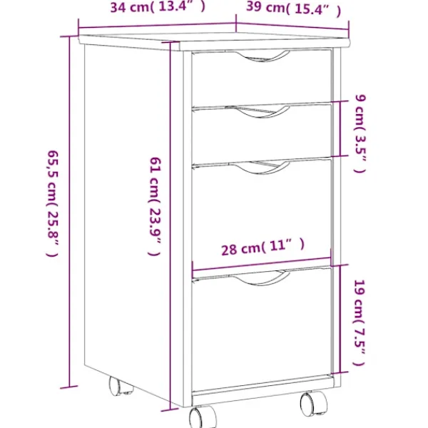 Denna hurts underlättar ditt arbete genom att göra det lätt att hålla saker organiserade och inom räckhåll. Flexibla hjul: Hjulen gör att hurtsen snabbt och enkelt kan flyttas till en annan plats.Gott om förvaring: Hurtsen har gott om förvaringsutrymme för att förvara eller kategorisera dina dokument, böcker eller akter. Den är lämplig att placera under din arbetsstation för att maximera golvytan. Det konkava handtaget gör det enkelt att öppna lådorna.Massivt furuträ: Massivt furuträ är ett vackert naturmaterial. Furuträ har raka fibrer, och knutarna ger materialet sin rustika utstrålning.Många användningsområden: Med sin enkla design passar hurtsen bra in i alla rum. Den blir en praktisk förvaringslösning i vardagsrummet, sovrummet, köket, garaget, kontoret eller pysselrummet!Lätt att rengöra: Kontorsskåpet har en slät yta som är lätt att rengöra med en fuktig trasa.