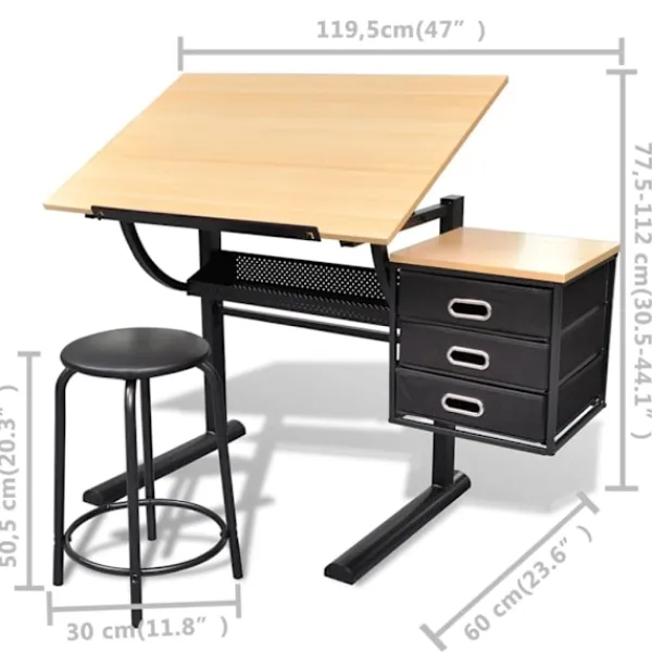 Det här arkitektbordet har gott om bekväm arbetsyta och kommer att bli ett fantastiskt hjälpmedel för ditt tecknande, skrivande osv. Det här högkvalitativa bord med lutningsbar bordsskiva ger gott om arbetsyta, vilket gör att det passar perfekt för studering och tekniskt ritande. Papperstopparen håller kvar papper på bordet medan bänken lutar. Vårt skrivbord har även tre utdragbara lådor för extra förvaring. Pallen som ingår är tjockt vadderad för att du ska kunna ha det bekvämt när du jobbar. Bordet är tillverkat av högkvalitativ MDF och hålls upp av pulverlackerade järnben för hållbarhetens skull, vilket innebär att du kommer att kunna använda det i många år.