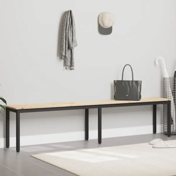 Den här moderna bänken förenar stil och funktion. Den passar perfekt som sittlösning i matsalar, på verandor eller i entréer. Med sina enkla linjer och minimalistiska design ger den en samtida känsla som passar många olika inredningar. Tillverkad av hållbart massivt tall som står på robusta fyrkantiga metallben, är den klar för både – fest eller vardag.