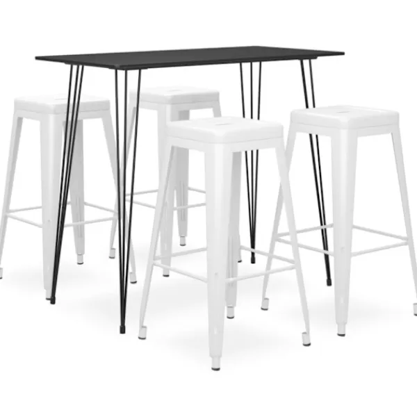 Bordsskivan är tillverkad i MDF, som är lätt att torka av. Den pulverlackerade metallramen gör bordet robust och stabilt. Barstolarna är tillverkade av metall med en målad yta, vilket gör de starka och hållbara. Den förstärkta tvärstången under sits och fotstödet förbättrar stabiliteten. Stolarna kan staplas för enkel förvaring, vilket är perfekt i begränsade utrymmen.