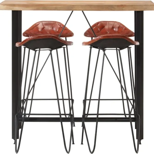 Dessa barmöbler har ett industriellt utseende och kommer att bli ett utmärkande komplement i hemmet, baren eller restaurangen. Barbordet är handgjort i massivt trä. De starka stålbenen gör barbordet mycket robust och hållbart och bidrar till dess spektakulära industriella stil. Dessutom garanterar det perfekta hantverket att varje steg i processen utförs med högsta omsorg, vare sig det är polering, målning och lackering. Klädseln i äkta läder är mjuk att ta på och gör barstolarna mycket hållbara. Det mjuka getskinnet med fina diamantformade sömmar ger en bekväm sittupplevelse medan de massiva järnbenen med fotstöd gör stolarna stadiga och hållbara. Vår bargrupp är enkel att montera. Vid leverans medföljer 1 bord och 4 stolar i äkta läder. Viktigt: Färger och träfibrer varierar från möbel till möbel, vilket gör varje produkt unik. Leveransen är slumpartad, vilket säkerställer varje produkts exklusivitet och individualitet.