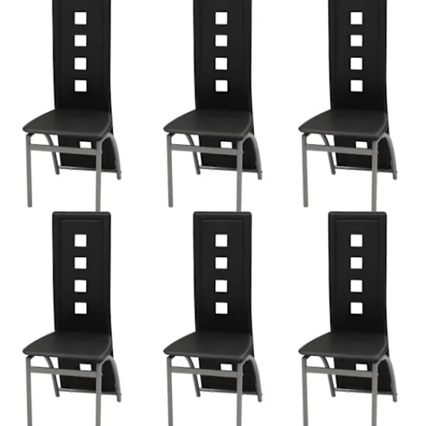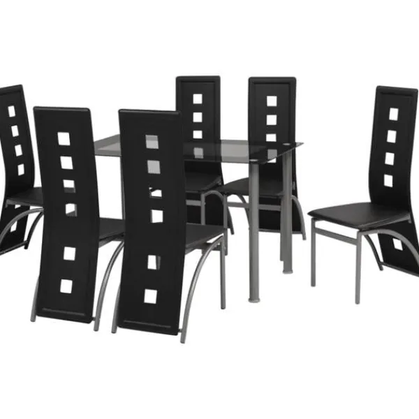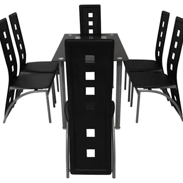 Denna moderna uppsättning matsalsmöbler, bestående av 7 delar, har en elegant samt modern design och är perfekt för dem som funderar på att tillföra en känsla av stil i sin inredning. Den pulverlackerade stålramen ger bordet gott om stöd, glasskivan har en svart kant är tillverkad av härdat glas som är lätt att rengöra. De fantastiska stolarna är moderna men samtidigt tidlösa. Tack vare sin ergonomiska design är de högst bekväma och stålramen gör dem väldigt stabila och hållbara. Monteringen är väldigt enkelt. I leveransen får du 1 bord och 6 stolar.