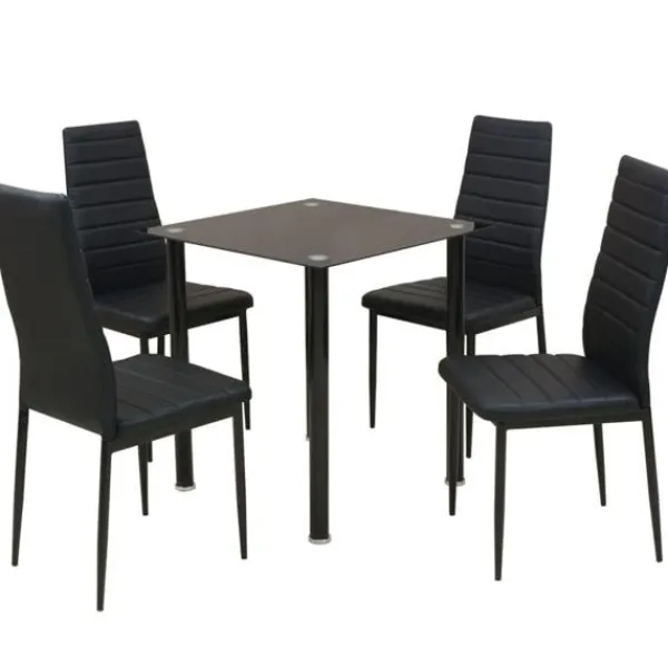 Denna svarta matgrupp består av 5 delar och har en simpel modern design, perfekt för de som letar efter en krydda elegans till inredningen. Bordsskivan är tillverkat i härdat glas vilket både har hög styrka samt är enkelt att rengöra. Tack vare den tjocka vadderingen på både sittytan och ryggstödet erbjuder stolarna utomordentlig sittkomfort. De massiva pulverlackerade stålramarna är väldigt stabila och hållbara. Montering är väldigt enkel. Leverans inkluderar 1 bord och 4 stolar.