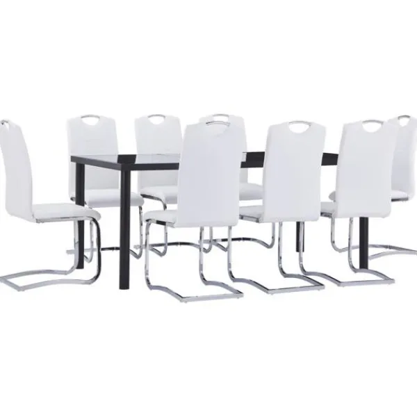Vår matgrupp har en elegant och modern design och passar perfekt i moderna hem, matrum eller kommersiella restauranger. Dess stilrena och moderna design kommer att komplettera din inredning. Bordet har en slät bordsskiva i härdat glas som är enkel att rengöra med en fuktig trasa. Den pulverlackerade metallramen bidrar till dess massiva konstruktion och gör den mycket stabil och hållbar. Stolarna är klädda i mjukt konstläder och är tjockt stoppade för maximal komfort. Dess ergonomiska design gör matstolen mycket bekväm att sitta på. Tack vare den kromade stålramen är stolarna robusta och stabila. Dessutom har stolarna ett handtag i ryggstödet så att de enkelt kan flyttas. Matgruppen är enkel att montera. Vår matgrupp är perfekt när du bjuder in familj och vänner på middagsbjudningar.