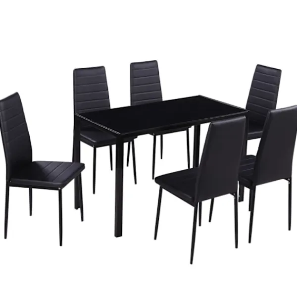 Detta svarta matbordsset har en elegant och modern design, det är perfekt för dom som både vill ha komfort och elegans i sin matsal eller sitt kök. Bordsskivan är tillverkad av starkt, härdat glas som är enkelt att rengöra. Varje stol är beklädd med konstläder. Den spänstiga, vadderade sitsen är väldigt bekväm. I leveransen får du 1 bord och 6 stolar.