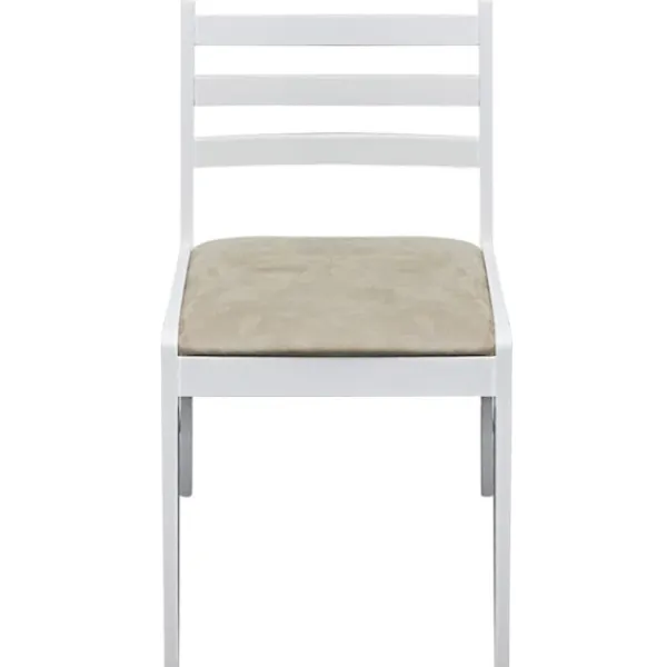 De fyrkantiga ryggstöden ger dem en rustik charm och utökad sittkomfort tillsammans med den vadderade sitsen som är klädd i slät och mjuk polyester. Den massiva konstruktionen i gummiträ gör dem såväl stabila som slitstarka.