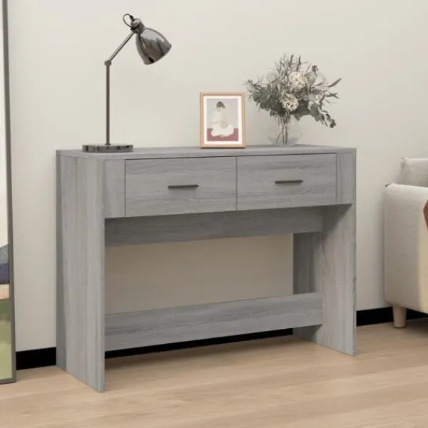 Det här strömlinjeformade konsolbordets mångsidiga design bidrar till extra förvaring i din entré, vardagsrum eller hall. Stabilt material: Det konstruerade träet är av exceptionell kvalitet med slät yta och är också starkt, stabilt och fuktbeständigt.Förvaringsutrymme: Hallbordet är utrustat med 2 lådor för att förvara dina nycklar, kort, glasögon eller några ofta använda föremål.Rymlig ovansida: Detta sidobord har en rymlig ovansida med gott om utrymme för att lägga dina viktiga föremål, som dekorativa ornament, en vas med blommor, inramade foton etc. Varning:För att förhindra att den välter måste denna produkt användas med den medföljande monteringsanordningen för vägg Observera:Varje produkt levereras med en monteringsmanual i lådan för enkel montering.