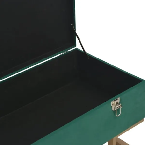 Vår bänk i sammet blir garanterat ett blickfång i vardagsrummet, hallen eller salongen. Den gröna sammetsklädseln är mjuk och mycket mysig samtidigt som den ger din inredning en färgglad detalj. Den har ett inbyggt förvaringsutrymme med extra plats för att förvara dina prylar. De guldmålade benen i pulverlackerat järn bidrar dessutom till hallbänkens stabilitet och hållbarhet. Vår bänk blir en elegant dekoration i din inredning och en oumbärlig del av ditt rum. Sammetsbänken är enkel att montera.