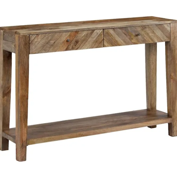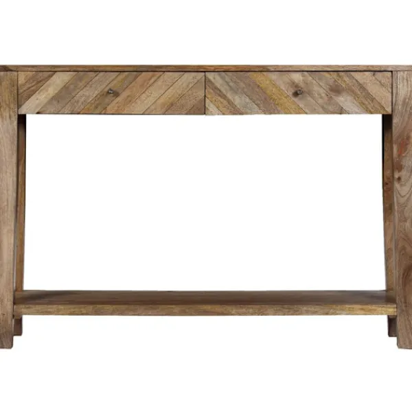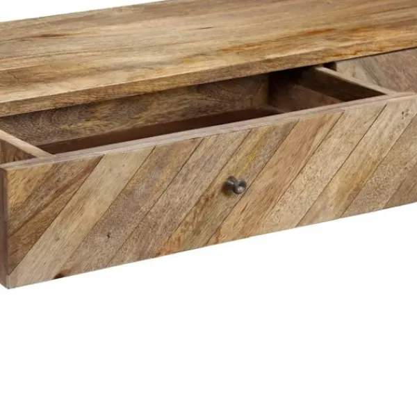Konsolbordet i trä utstrålar en rustik charm och blir ett fint tillägg i din inredning. Sidobordet är tillverkat i massivt mangoträ som har polerats, målats och lackerats men har ändå kvar sin naturliga färg och ett grovt utseende. Detta bord är helt handgjort och de vackra träådringarna gör varje möbel unik och något annorlunda från de andra. Detta sidobord har en robust och stabil yta där du kan ställa fruktkorgar, vaser eller andra dekorativa föremål. Konsolbordet har två lådor och en hylla med gott om utrymme för att hålla dina tidskrifter, böcker och andra små föremål inom räckhåll. Monteringen är enkel. Viktigt: Färger varierar från möbel till möbel, vilket gör varje möbel unik. Leveransen är slumpartad, vilket säkerställer varje produkts exklusivitet och individualitet.