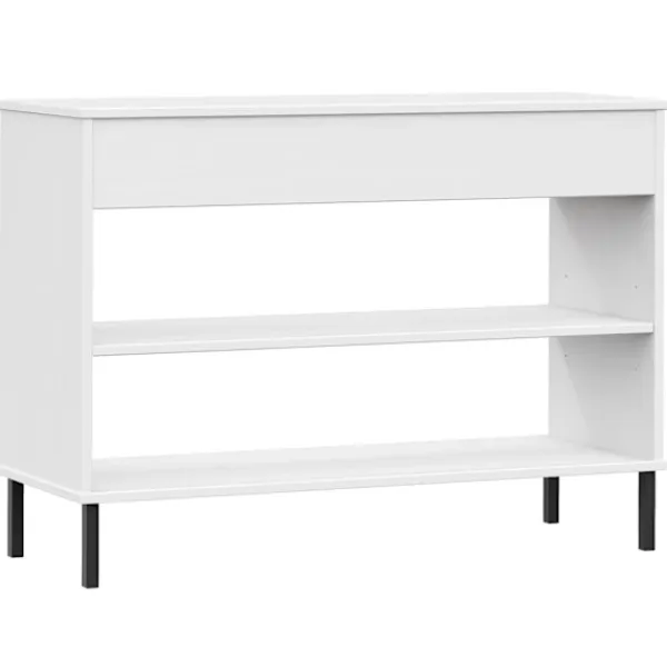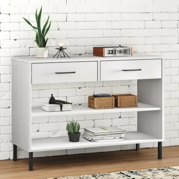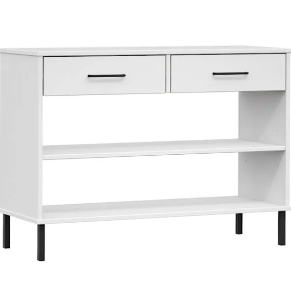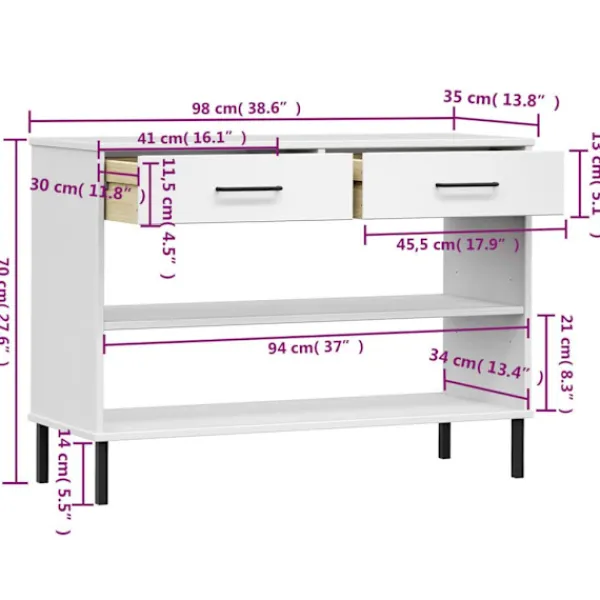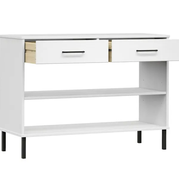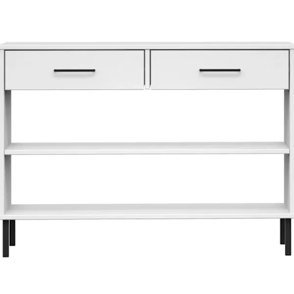 Få en vacker känsla i ditt rum med detta klassiska konsolbord i trä! Det är ett praktiskt och dekorativt tillskott till din heminredning. Hållbart material: Massivt furuträ är ett vackert naturmaterial. Furuträ har raka fibrer, och knutarna ger materialet sin signatur, rustikt utseende.Gott om förvaring: Bordet har 2 lådor och 2 öppna fack, med gott om plats för att hålla dina saker välorganiserade och inom räckhåll. Robust toppskiva: Toppskivan är perfekt för att visa upp dekorationer, foton och krukväxter. Metallben: Hallbordets metallben säkerställer robusthet och stabilitet. Varning:För att förhindra att den välter måste denna produkt användas med den medföljande monteringsanordningen för vägg Observera:Varje produkt levereras med en monteringsmanual i lådan för enkel montering.