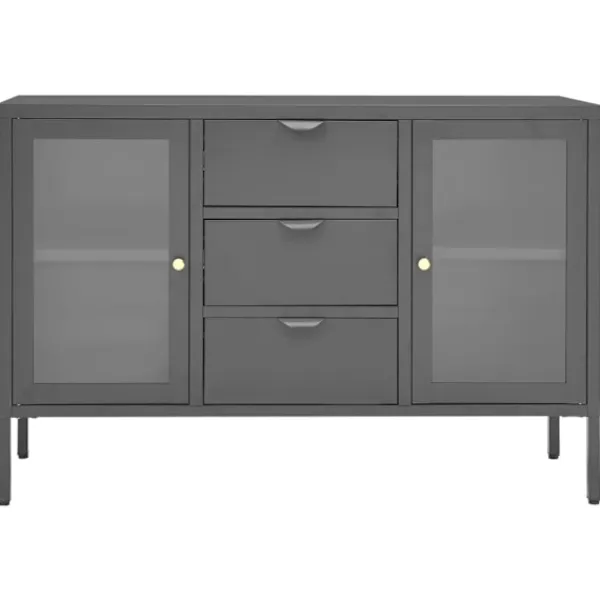 Denna moderna skänk har en elegant och klassisk design och blir ett dekorativt och praktiskt tillskott i din inredning. Förvaringsskåpet är tillverkat av stål och härdat glas, vilket gör det stabilt och tåligt och kommer stå sig i många år. Skåpet har 2 justerbara hyllor och 3 lådor, med gott om förvaringsutrymme för att hålla dina DVD-skivor, multimedieapparater, böcker och små väsentliga föremål organiserade och inom räckhåll. Lådan med 3 sektioner kullager ger smidig öppning och stängning. Dessutom är skåpet lätt att rengöra med en fuktig trasa.