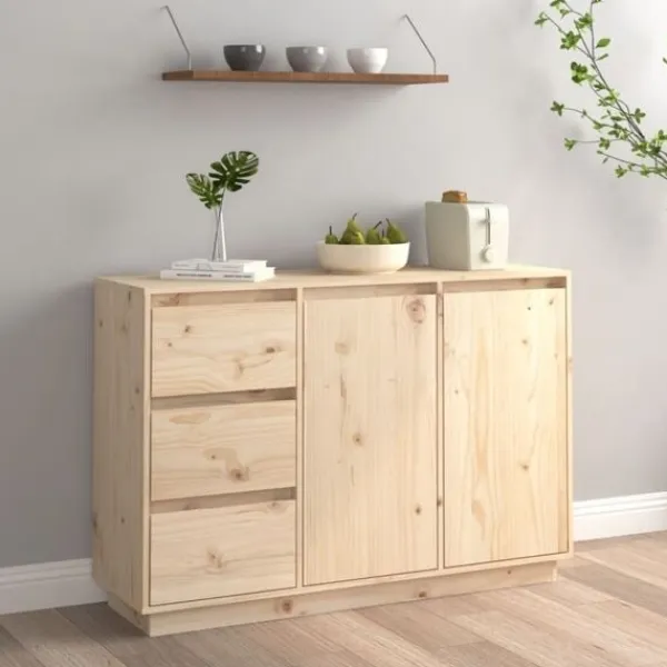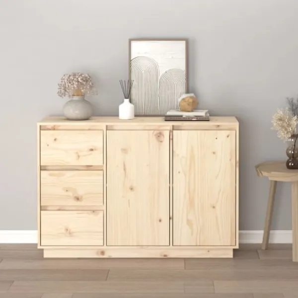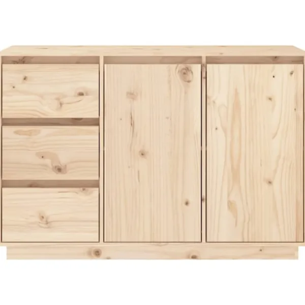Denna skänk i trä är ett perfekt komplement till ditt sovrum eller vardagsrum och gör ett bestående intryck! Premium material: Massivt furuträ är ett vackert naturmaterial. Behandla ytan med olja, vax eller lack för en starkare yta och enkel rengöring. Furuträ har raka fibrer, och knutarna ger materialet sin signatur, rustikt utseende.Gott om förvaringsutrymme: Skänken har 2 dörrar och 3 lådor, med gott om förvaringsutrymme för att hålla dina olika föremål organiserade och inom räckhåll.Visningsfunktion: Den robusta bordsskivan är idealisk för att visa dekorativa föremål, fotoramar eller krukväxter på. Varning:För att förhindra att den välter måste denna produkt användas med den medföljande monteringsanordningen för vägg