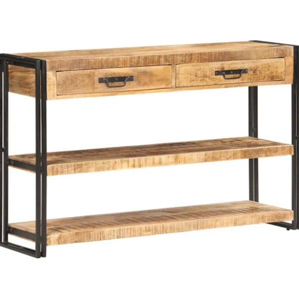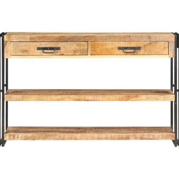 Förvaringsskänken är tillverkad i massivt mangoträ, ett tropiskt lövträ. Det är starkt nog att bära vikten och är även mycket hållbart. Det fina hantverket och de vackra träådringarna gör varje möbel något unik. Den starka pulverlackerade järnramen bidrar till dess stadighet. Den stadiga ovansidan är perfekt för att visa upp prydnadssaker som fotoramar eller krukväxter. Dessutom har konsolbordet 2 lådor och 2 hyllor för organisering av böcker, tidskrifter och andra saker inom räckhåll.