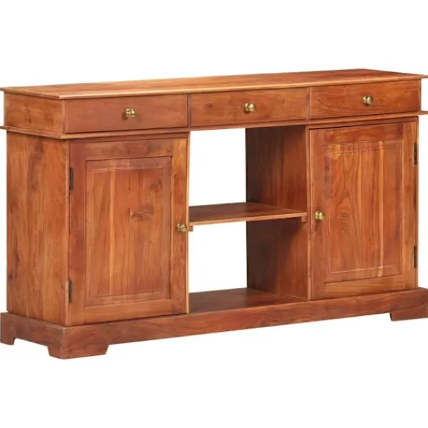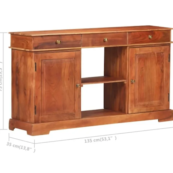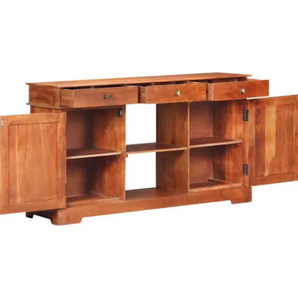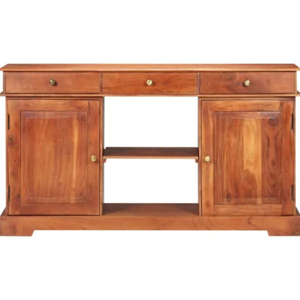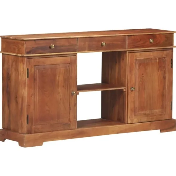 Denna skänk i trä ger din inredning en känsla av rustik charm med sin tidlösa design. Skänken är tillverkad i massivt akaciaträ med honungsbrun yta, vilket gör den stadig och hållbar. Massivt akaciaträ är ett tropiskt lövträ som har vackra ådringar och ger möbeln en naturlig stil. Varje steg i processen utförs med största omsorg, vare sig det är polering, målning eller lackering. Skåpet har 2 dörrar, 2 utrymmen och 3 lådor med gott om förvaringsutrymme för böcker och andra ägodelar. Den stadiga bordsskivan är perfekt för att visa upp prydnadssaker, fotoramar och andra saker. Dessutom är den enkel att rengöra med en fuktig trasa. OBS: Färger och ådringar varierar från möbel till möbel, vilket gör varje produkt unik. Leveransen är slumpartad.