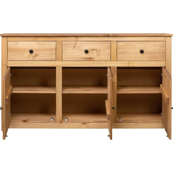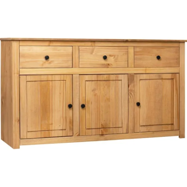 Denna skänk är tillverkad i massiv furu och är ytterst hållbar och stadig. Den erbjuder stort förvaringsutrymme med sina 3 lådor och 3 utrymmen. Den robusta bordsskivan är perfekt för att visa upp dekorativa föremål, fotoramar eller krukväxter. Den kan enkelt torkas av med en torr trasa. Skänken är enkel att montera.