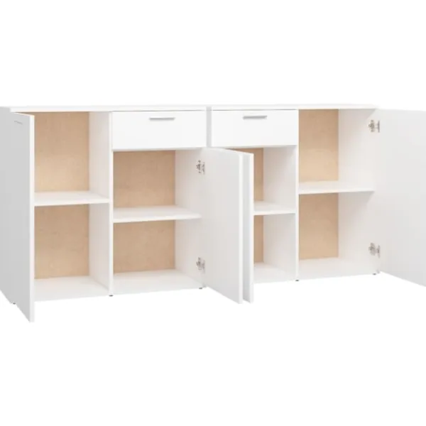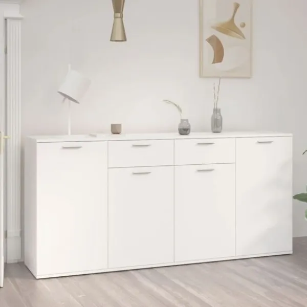 Dessa skänkar med minimalistisk charm uppfyller dina olika behov och är perfekta att ha i alla sorters rum. Robust material: Det konstruerade träet är av exceptionell kvalitet med slät yta och är också starkt, stabilt och fuktbeständigt.Gott om förvaring: Förvaringsskåpet har gott om förvaringsutrymme för att hålla dina saker välorganiserade. Visningsfunktion: Den robusta bordsskivan är perfekt för att visa upp dekorationer, inramade foton eller krukväxter.Praktiska dörrar: Håll dina väsentligheter fria från damm genom att förvara dem i denna skänk. Varning:För att förhindra att den välter måste denna produkt användas tillsammans med det medföljande väggfästet.