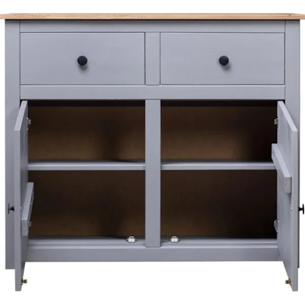 Denna träskänk i massivt trä har en rustik och trendig design och blir ett både dekorativt och praktiskt tillskott i din inredning. Tack vare skänkens 2 lådor och 2 luckor kan du förvara dina tidskrifter, böcker, DVD:er och mediaenheter organiserat och inom räckhåll. Dess robusta ovansida är en perfekt plats att ställa dekorativa föremål som vaser eller krukväxter. Skåpet är tillverkat i massiv furu. Varje steg i processen utförs med största omsorg, vare sig det är polering, målning eller lackering. Det skickliga hantverket och de vackra träådringarna gör varje möbel unik och något olik alla andra. Viktigt: Färger och fibrer kan variera från produkt till produkt, vilket gör varje skåp unikt. Leveransen är slumpartad, vilket säkerställer varje produkts exklusivitet och individualitet.