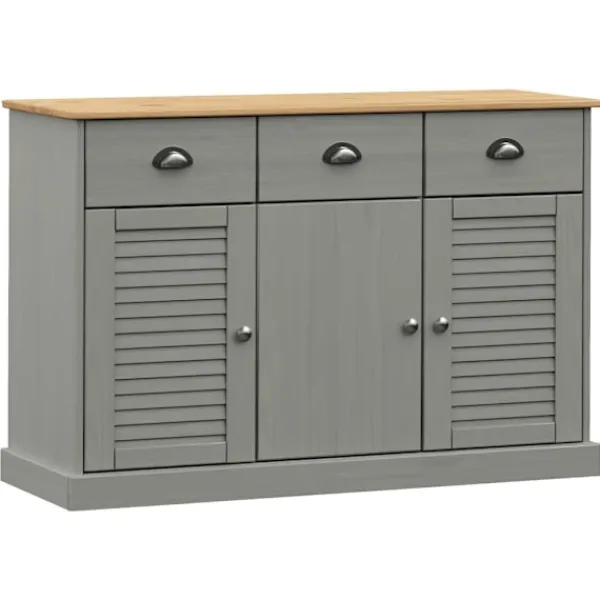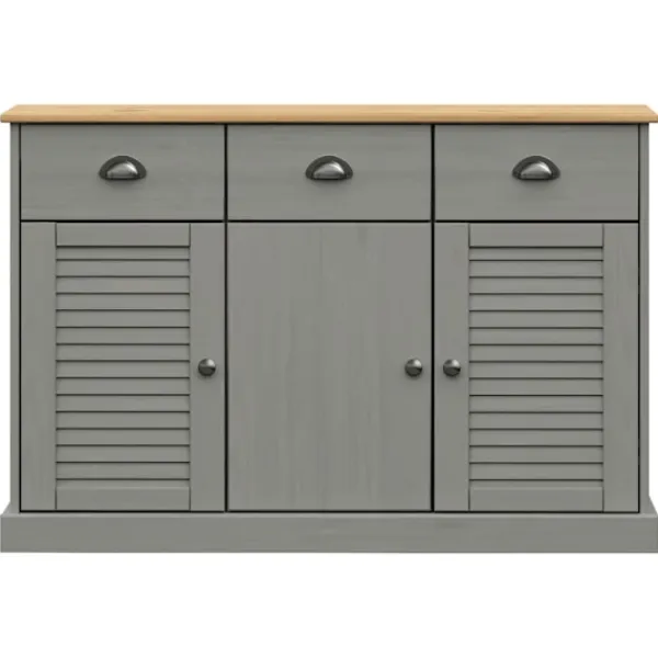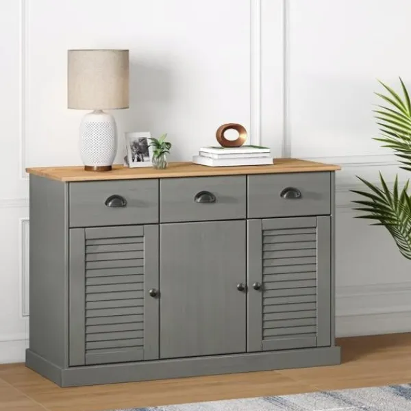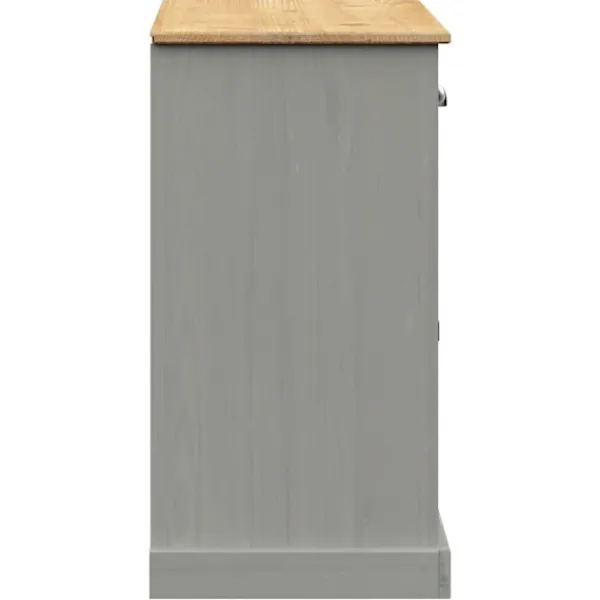 - Material: Massiv furu med grå finish, konstruerat trä, metall
