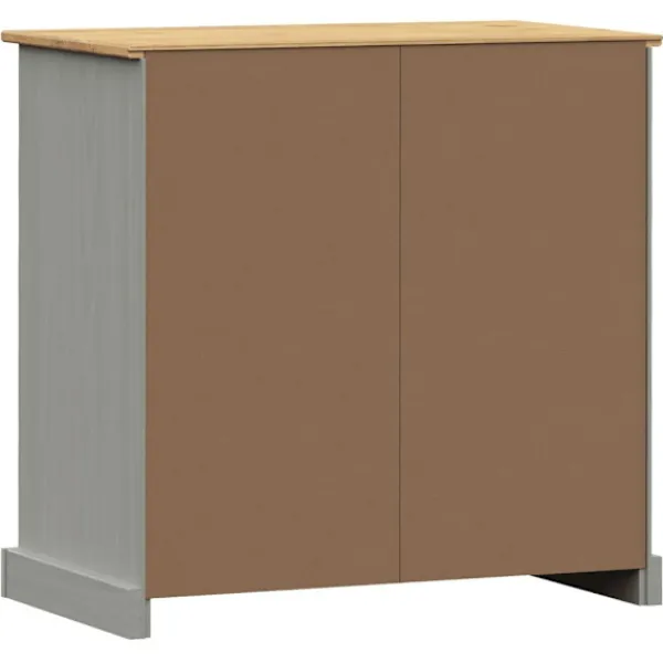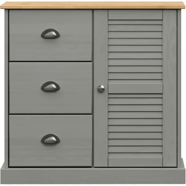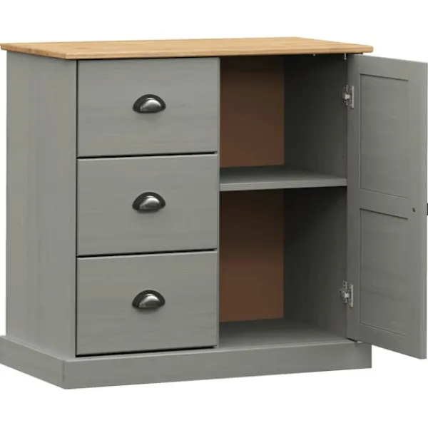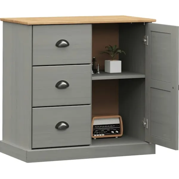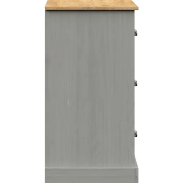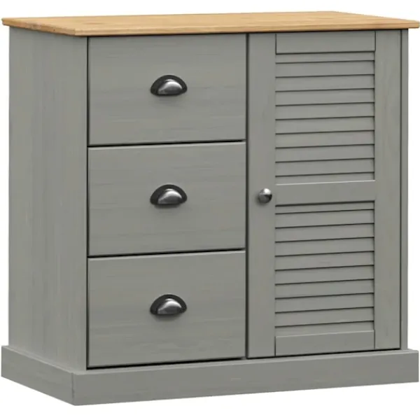 - Material: Massiv furu med grå finish, konstruerat trä, metall