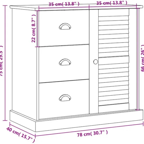 Om du har begränsat med utrymme men behöver mer förvaring är denna kompakta men fina byrå till stor hjälp! Massiv furu: Massivt furuträ är ett vackert naturmaterial. Furuträ har raka fibrer, och kvistarna ger materialet en rustik utstrålning. Då det är tillverkad i massiv furu är skänken slitstark och robust.Rymlig och funktionell förvaring: Med lådor och fack erbjuder skänken gott om utrymme för att hålla dina saker organiserade. Dessutom har den flera användningsområden. Skåpet kan också användas som buffé, köksskänk eller sidoskåp för vardagsrum eller hall.Lätt att underhålla: Byrån är lätt att rengöra med en fuktig trasa och kräver minimalt underhåll.Metallhandtag och knoppar: Sköänken levereras med metallhandtag och knoppar som gör det enkelt att öppna och stänga den, samtidigt som det förhöjer dess skönhet. Varning:För att förhindra att den välter måste denna produkt användas tillsammans med det medföljande väggfästet.