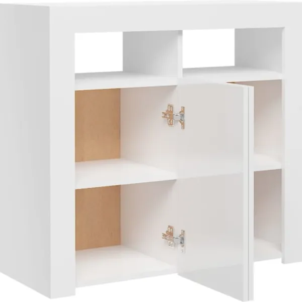 Denna skänk med LED med minimalistisk design blir ett såväl praktiskt som dekorativt tillskott i ditt hem. Hållbart material: Det konstruerade träet är av exceptionell kvalitet med slät yta och är också starkt, stabilt och fuktbeständigt.RGB LED-belysning: Sängen är utrustad med färgglada RGB LED-lampor. Med olika anpassningsbara menyer kan du enkelt ändra färg på lamporna och till och med ställa in dem så att de justeras automatiskt. Dessa LED-lampor förbättrar inte bara skåpets moderna utseende utan bidrar också till dess trendiga utseende.Gott om förvaringsutrymme: Förvaringsskåpet har gott om utrymme för att hålla dina vardagsprylar snyggt organiserade och inom räckhåll.Visningsfunktion: Den robusta bordsskivan är perfekt för att visa upp dekorationer, inramade foton eller krukväxter.Praktiska dörrar: Håll dina väsentligheter fria från damm genom att förvara dem i denna skänk. Bra att känna till:Denna produkt har en USB-kontakt som kräver en certifierad 5V USB-strömkälla (ingår ej).