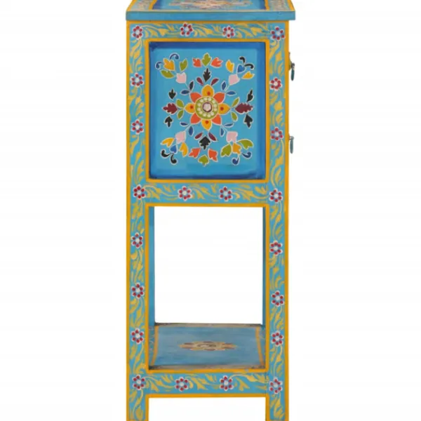 Denna vackra träskänk är handgjord av massivt mangoträ och prydd med handmålade dekorationer. Den kommer att bli ett iögonfallande tillskott till ditt hem med sin färgglada design.