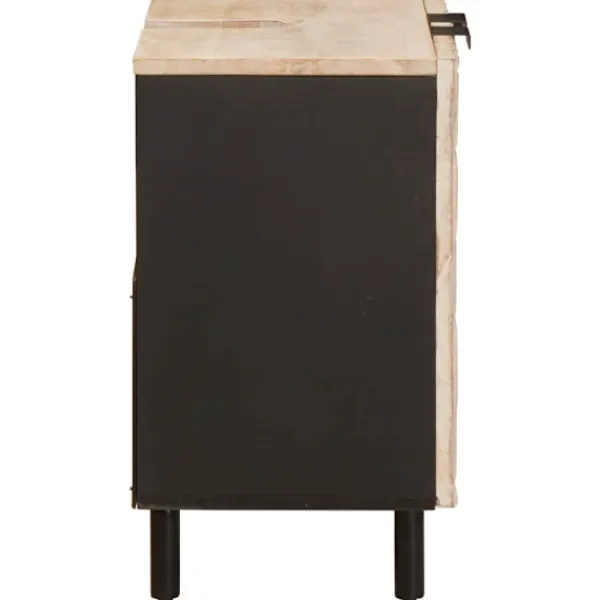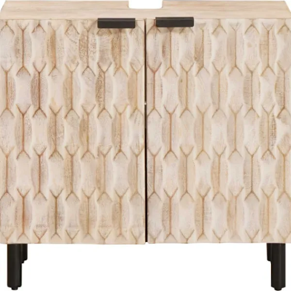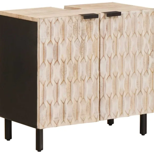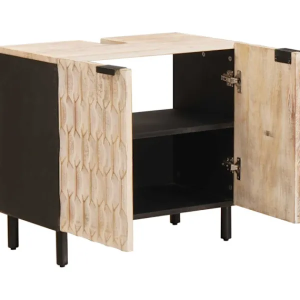 Detta moderna badrumssinkskåp är både funktionellt och stiligt, gjort av massivt mangoträ. Med måtten 62 x 33 x 58 cm passar det bra i alla badrum och för dem som gillar enkelhet med stil. Den rektangulära formen gör att den smidigt passar mot väggar och i trånga utrymmen och ger en luftig känsla oavsett badrummets storlek. Detta skåp erbjuder smart förvaring för alla dina badrumsartiklar.