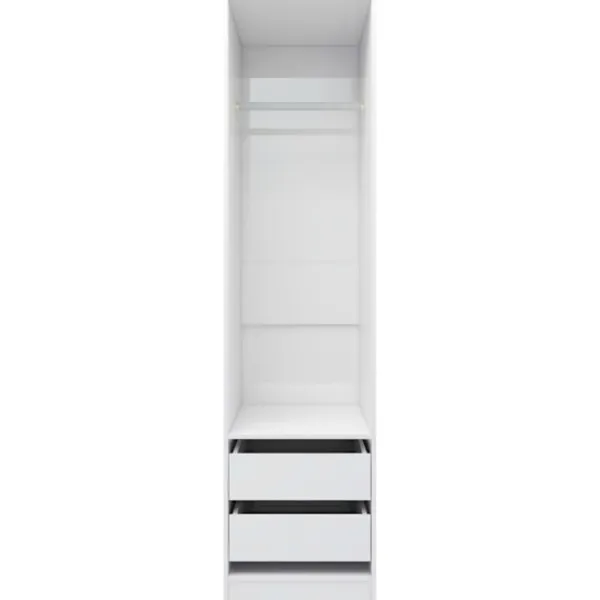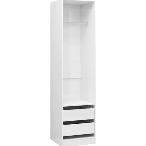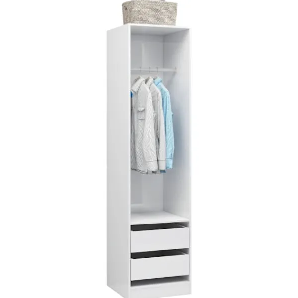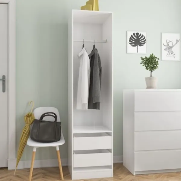 Denna kompakta garderob gör det enkelt att komma åt dina kläder eller favoritaccessoarer. Den blir en perfekt förvaringslösning och chic detalj i ditt hem. Garderoben är tillverkad av konstruerat trä, vilket säkerställer robusthet, hållbarhet och lång livslängd. Den har 2 lådor 1 stort, öppet utrymme med klädstång, med gott om plats både för längre klädesplagg och vikta kläder eller accessoarer såsom tjocktröjor, jeans, hattar, handväskor, osv. Produkten är lätt att rengöra. Denna garderob är lätt att montera.