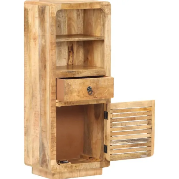 Högskåpet är tillverkat i grovt mangoträ med naturlig yta, ett tropiskt träslag som är mycket starkt. Det står även emot tidens tand, vilket gör det stabilt och hållbart. Hantverket och de vackra träådringarna gör varje möbel unik och något olik de andra. Skåpet har även en dörr, en låda och två hyllor för gott om förvaringsutrymme.