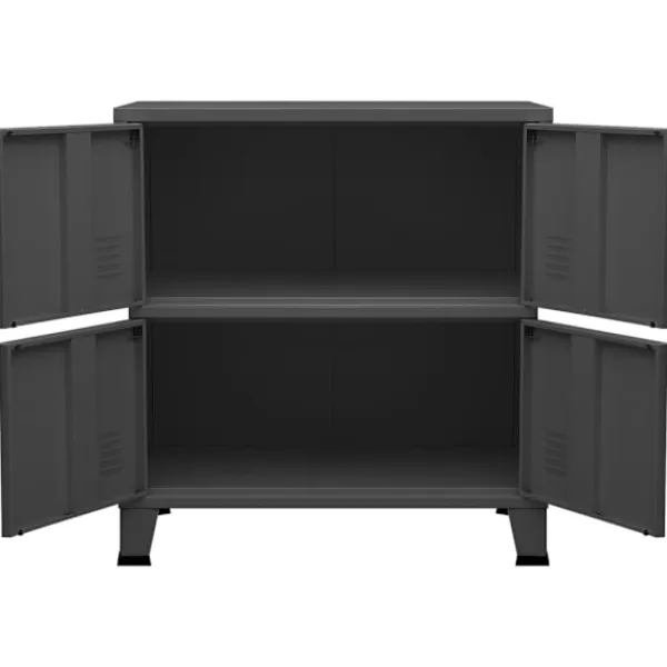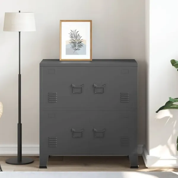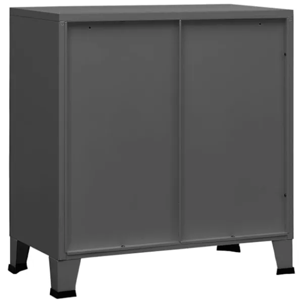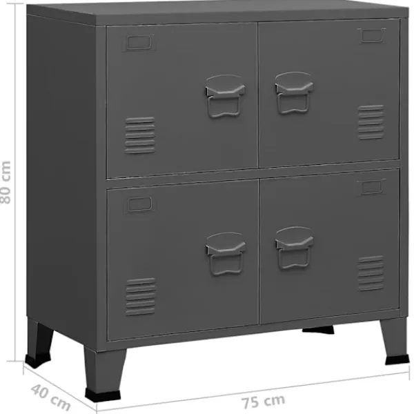 Detta industriella förvaringsskåp kommer att hålla ditt hem rent och organiserat! Det har en hylla och namnskyltar på dörrarna, där du kan sortera dina dokument snyggt i olika kategorier. Den passar alla kontorsinredningar tack vare sin ikoniska design och industriella charm. Stålfötterna med plastöverdrag förhindrar att dina golv repas. Detta skåp är tillverkat i stål, vilket gör det hållbart och enkelt att rengöra. Varje dörr är utrustad med en namnskyltshållare och luftventiler, som gör att du snyggt kan sortera dina föremål och understryka dess industriella utseende.