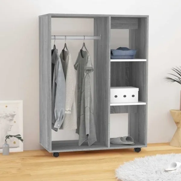 Denna garderob har en perfekt förvaringslösning för dina kläder, skor och accessoarer. Premium material: Det konstruerade träet är av exceptionell kvalitet med slät yta och har styrka, stabilitet och motståndskraft mot fukt.Gott om förvaring: Denna garderob har ett stort öppet fack och 3 sidohyllor, så att du kan förvara allt du vill ha till hands.Enkel rörelse: Hjulen under skåpet gör att du enkelt kan flytta den till rätt plats. VARNING:För att förhindra att den välter måste denna produkt användas med den medföljande monteringsanordningen för vägg
