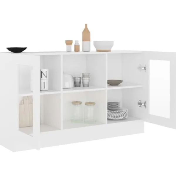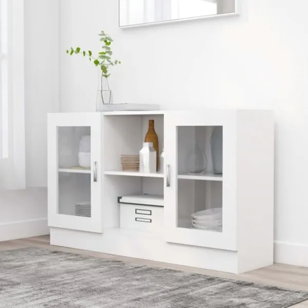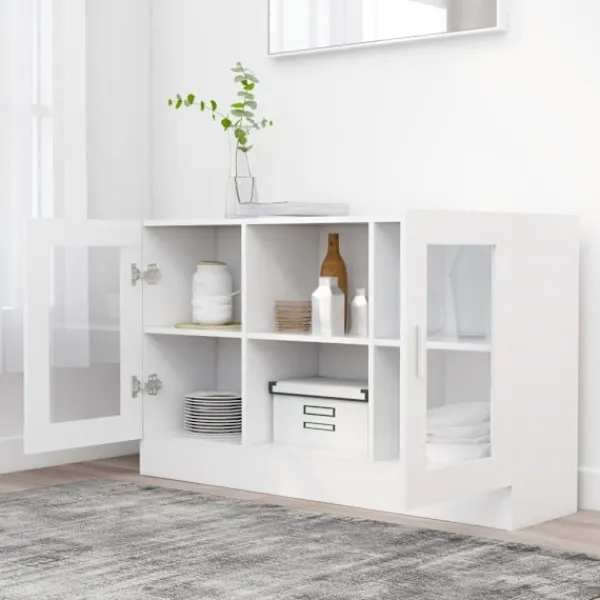 Detta trendiga vitrinskåp, med dess praktiska användbarhet, är tänkt att vara ett perfekt komplement till ditt rum. Detta förvaringsskåp som är tillverkat av premium konstruerat trä, är hållbart och stabilt. Skåpet har 2 fack och 2 dörrar, med gott om förvaringsutrymme för böcker, multimediaapparater och andra föremål, vilket gör ditt rum snyggt och rent. Den robusta bordsskivan är också perfekt för att visa dekorativa föremål, fotoramar och krukväxter. Dessutom är skåpet lätt att rengöra med en fuktig trasa.
