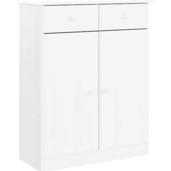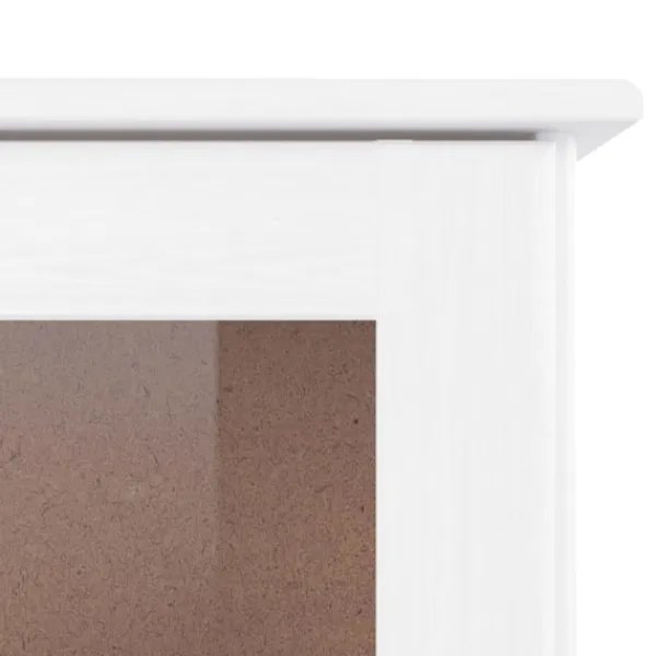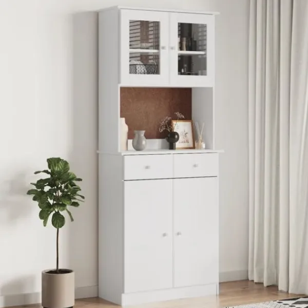 Detta vitrinskåp i trä med gott om förvaringsutrymme är ett perfekt komplement till ditt vardagsrum. Massiv furu: Massivt furuträ är ett vackert naturmaterial. Furuträ har raka fibrer, och kvistarna ger materialet en rustik utstrålning. Då det är tillverkad i massiv furu är skåpet slitstarkt och robust.Gott om förvaringsutrymme: Med hyllor, lådor och glasdörrar erbjuder högskåpet gott om förvarings- och visningsalternativ för dina favoritartiklar.Lätt att underhålla: Skåpet är lätt att rengöra med en fuktig trasa och kräver minimalt underhåll.Träknoppar: Skänken levereras med träknoppar som gör det enkelt att öppna och stänga, samtidigt som det förhöjer dess skönhet. Varning:För att förhindra att den välter måste denna produkt användas tillsammans med det medföljande väggfästet.