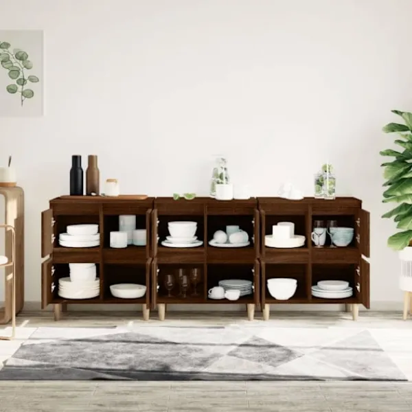 Dessa klassiska skänkar med ett tidlöst utseende kan bli ett perfekt tillägg i din heminredning. Hållbart material: Det konstruerade träet är av exceptionell kvalitet med slät yta och är också starkt, stabilt och fuktbeständigt. Skåpet är tillverkad av konstruerat trä och är lätt att rengöra med en fuktig trasa.Gott om förvaringsutrymme: Skåpet är utrustat med 4 utrymmen, vilket ger gott om förvaringsutrymme för att hålla dina olika dagliga saker välorganiserade och inom räckhåll.Visningsfunktion: Översidan av denna byrå är utmärkt för att placera dina dekorativa föremål, fotoalbum eller små växter på. Varning:För att förhindra att den välter måste denna produkt användas tillsammans med det medföljande väggfästet.