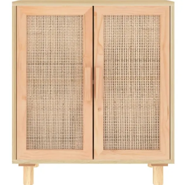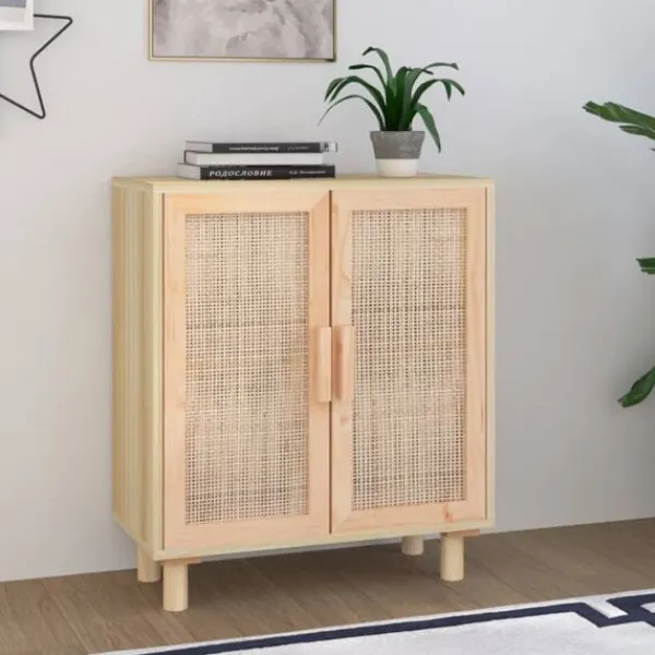 Denna skänk i trä uppfyller dina olika krav och blir ett perfekt tillskott i ditt rum. Hållbart material: Det konstruerade träet är av exceptionell kvalitet med slät yta och är också starkt, stabilt och fuktbeständigt.Gott om förvaringsutrymme: Skåpet är utrustat med 2 utrymmen med gott om förvaringsutrymme för att hålla dina olika dagliga saker välorganiserade och inom räckhåll. Dessutom är den fin tack vare dess dörrar i naturlig rotting.Fötter i massiv furu: Träfötterna ger skänken ett naturligt och behagligt utseende samtidigt som stabiliteten säkerställs. Den smälter in med vilken inredning som helst.Robust ovansida: Du kan också placera dina favoritfoton, dekorationer eller blommor ovanpå skåpet för att berika ditt rum. Observera:Varje produkt levereras med en monteringsmanual i lådan för enkel montering. Varning:För att förhindra att den välter måste denna produkt användas med den medföljande monteringsanordningen för vägg