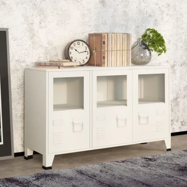 Denna industriella skänk med en enkel men praktisk design blir garanterat ett blickfång i ditt hem. Detta förvaringsskåp är tillverkat av metall och har en robust och hållbar konstruktion som garanterar många års användning. Skåpet har fack i glasdörren med gott om förvaringsutrymme för att förvara och visa upp dina böcker, tidskrifter, DVD-skivor, vaser och andra dekorativa föremål välorganiserat och inom räckhåll. Varje dörr är utrustad med en namnskyltshållare och luftventiler, som gör att du snyggt kan sortera dina föremål och understryka dess industriella utseende. Dessutom är den enkel att rengöra med en fuktig trasa.
