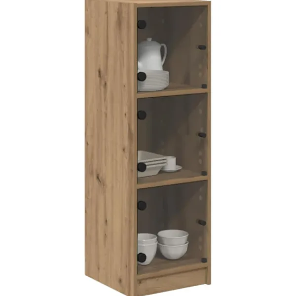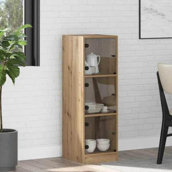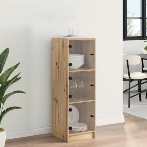 - Vackra glasdetaljer: De genomskinliga glasdörrarna ger en elegant touch och låter dig se innehållet samtidigt som det ser prydligt ut. Dessa detaljer gör den till en intressant del av rummet och passar bra med övriga möbler.
