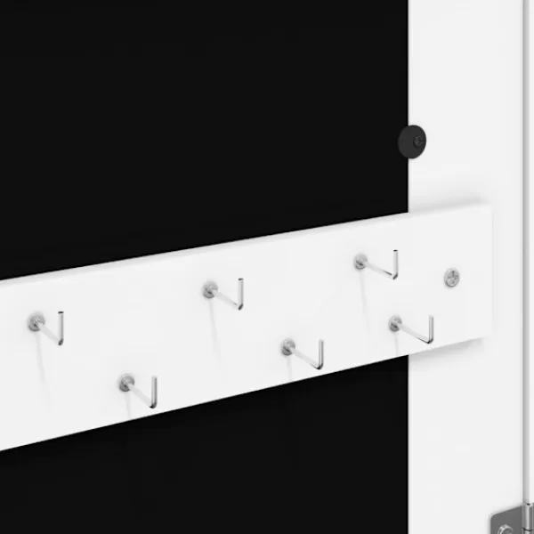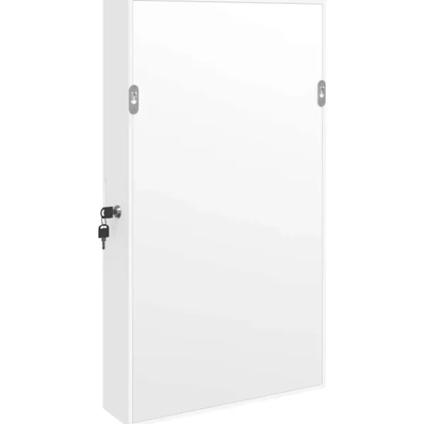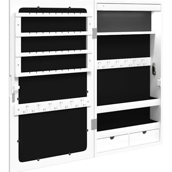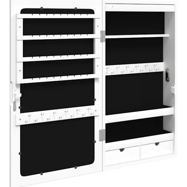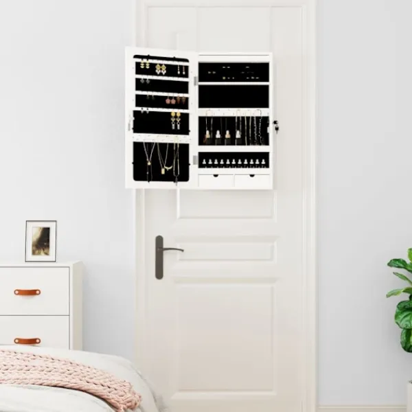 Förvara dina smycken och parfymer diskret och elegant förvarade med detta snygga spegelskåp med LED-lampor! Hållbart material: Det konstruerade träet är av exceptionell kvalitet med slät yta och är också starkt, stabilt och fuktbeständigt. Skåpet är tillverkad av konstruerat trä och är lätt att rengöra med en fuktig trasa.Gott om förvaringsutrymme: Förvaringsspegeln har 2 lådor och massor av krokar, hängare och hyllor för att hålla dina smycken snyggt organiserade och inom räckhåll.Praktisk spegel: Spegeln gör detta skåp perfekt för att göra sig redo och sminka sig.Hänsynsfullt skydd: Spegelskåpet har en låsbar dörr och levereras med 2 nycklar för att säkerställa säkerheten för dina föremål. Dessutom är det mjuka tygöverdraget inuti inte bara snyggt utan skyddar också dina älskade smycken från repor.Praktiska LED-lampor: Längst upp på insidan tänds LED-lamporna automatiskt när luckan öppnas, vilket gör det lättare för dig att hitta dina smycken.Platsbesparande design: Häng spegelskåpet över dörren med de medföljande krokarna eller montera den på väggen för att spara golvyta. Bra att känna till:Skruvar för väggmontering ingår.3 AA-batterier krävs men ingår inte i leveransen.