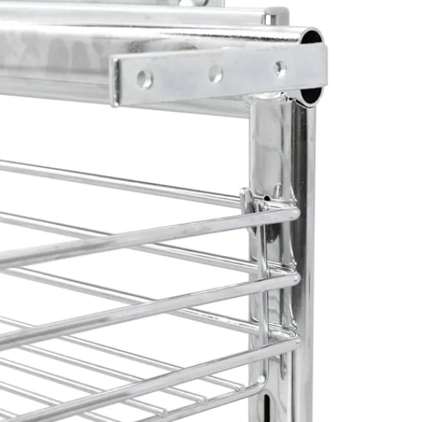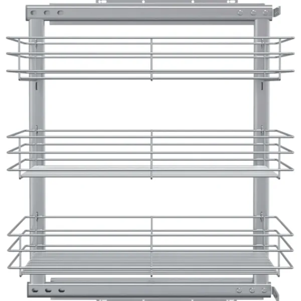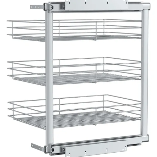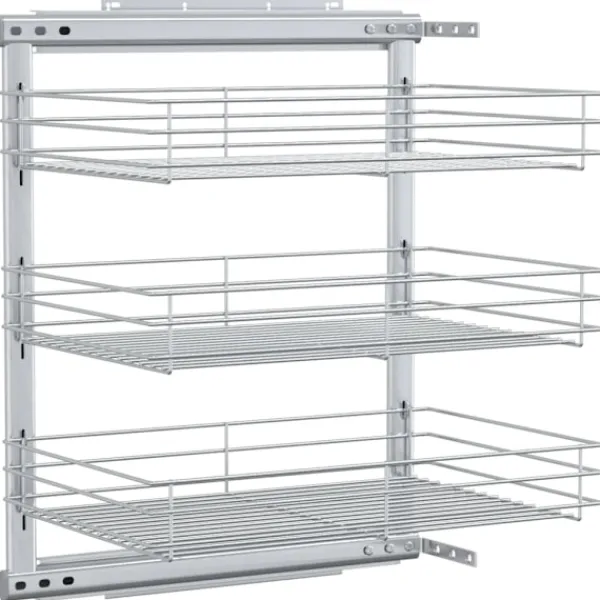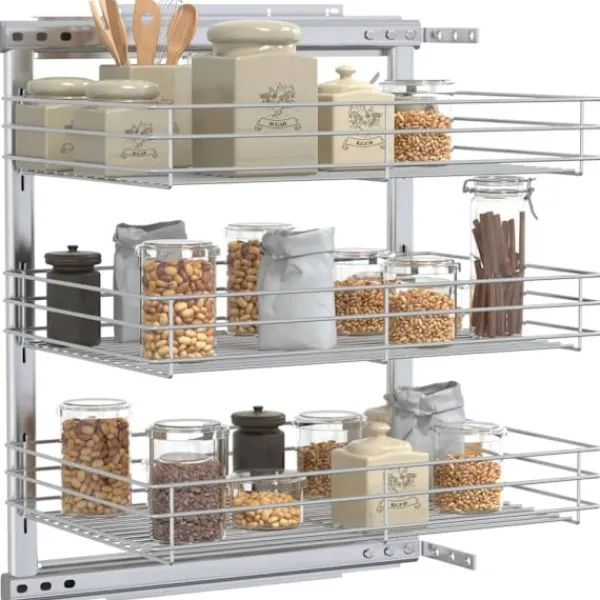 Vår utdragbara inredning är enkel att installera i ditt köksskåp med de medföljande monteringstillbehören. Den är utrustad med 3 hyllor och presenterar en enkel och praktisk lösning för att optimera ditt förvaringsutrymme i köket. Eftersom den är tillverkad i elektropläterad tråd utstrålar den en ren och modern charm och är samtidigt väldigt hållbar. Dessutom går den väldigt tyst tack vare dess skenor.