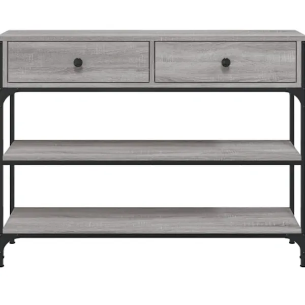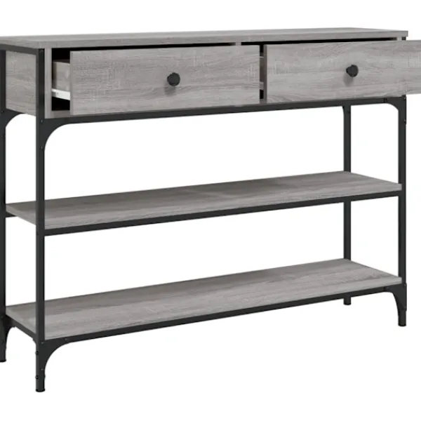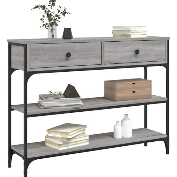 Få en elegant känsla i hallen, vardagsrummet eller entrén med detta snygga avlastningsbord. Hållbart material: Det konstruerade träet är av exceptionell kvalitet med slät yta och är också starkt, stabilt och fuktbeständigt. Med konstruerat trä som byggmaterial är soffbordet lätt att rengöra.Gott om lagringsutrymme: Hallbordet har gott om lagringsutrymme för att hålla dina tidskrifter, böcker och andra dekorativa föremål välorganiserade och inom räckhåll.Justerbara fötter: Fyra justerbara fötter med plasttassar håller hallbordet balanserat på ojämnt underlag och ökar stabiliteten.Metallram: Metallramen lägger till en industriell stil till din interiör samtidigt som den garanterar hållbarhet och stabilitet. Varning:För att förhindra att den välter måste denna produkt användas tillsammans med det medföljande väggfästet.