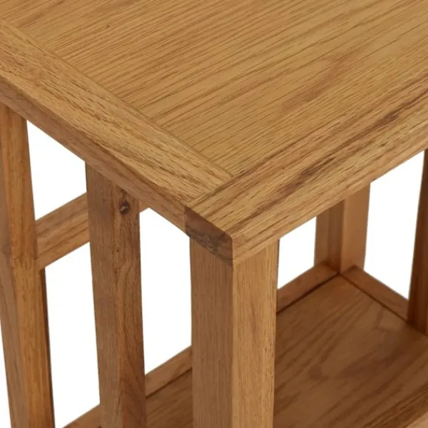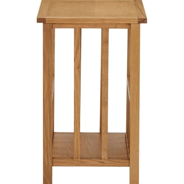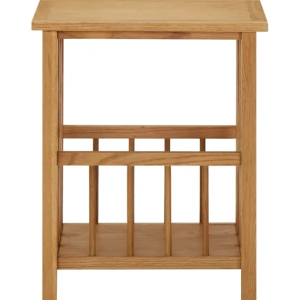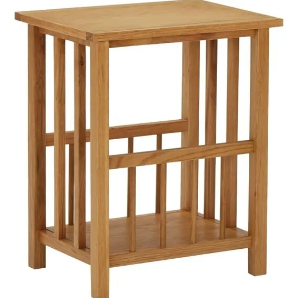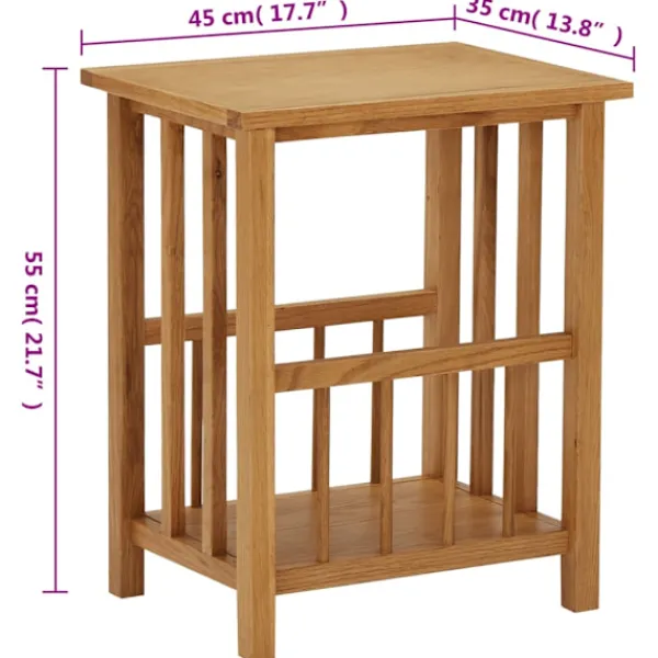 Vårt sidobord har en enkel men elegant design och tillför en rustik charm till din inredning. Tidningsstället är skickligt tillverkat av massiv ek och MDF, vilket gör det hållbart och praktiskt. Tack vare sin kompakta design tar bordet upp lite plats och är enkelt att flytta runt. Den stadiga bordskivan är perfekt för att visa upp dekorationer, fotoramar eller krukväxter. Det har även en hylla, vilket gör det perfekt för tidningar och tidskrifter.