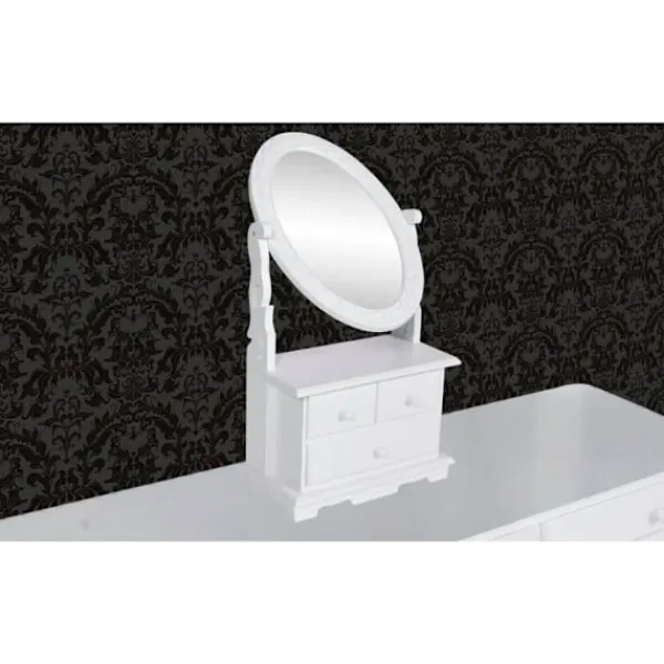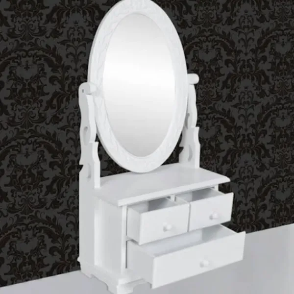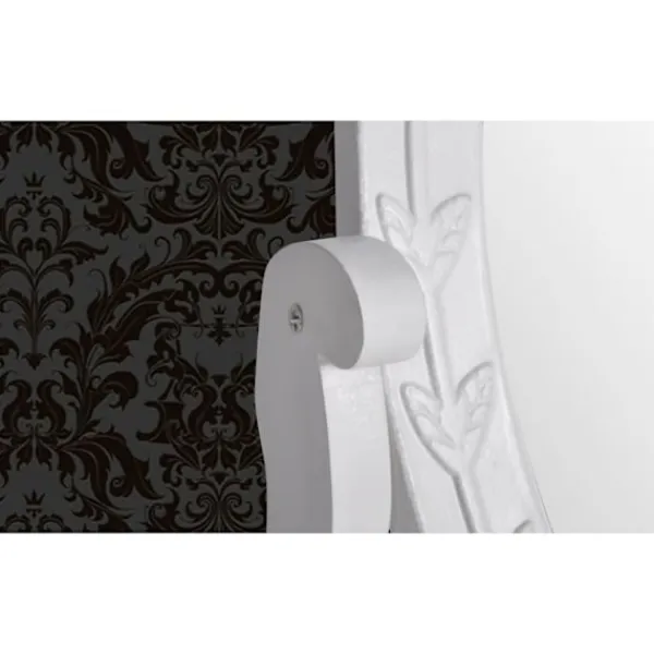 Denna vackra sminkspegel är gjord av vitmålat trä och har en vinkelbar oval spegel . Bordsspegelen står på en vit bas med 2 små lådor och en stor låda för förvaring av exempelvis smink, parfym, smycken etc. Lådorna kan enkelt tas ut vid rengöring. Vår romantiska make up spegel kan enkelt placeras på en byrå, ett bord eller en låg garderob.
