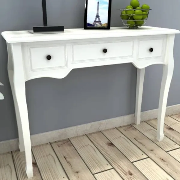 Bordet kombinerar ett utmärkt hantverk med praktisk funktionalitet. Tack vare sin kompakta design tar vårt konsolbord väldigt lite plats och passar in i mindre utrymmen. Tre, mjukt glidande lådor ger dig utökat förvaringsutrymme för dina smycken, smink och andra privata tillhörigheter.