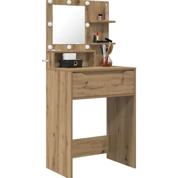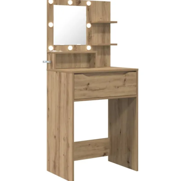 - Konstruerat trä Det här bordet är gjort av hållbart konstruerat trä, som ger en slät och stark yta för varje dags användning. Dess robusta konstruktion garanterar lång livslängd och är perfekt för alla typer av sovrum.
