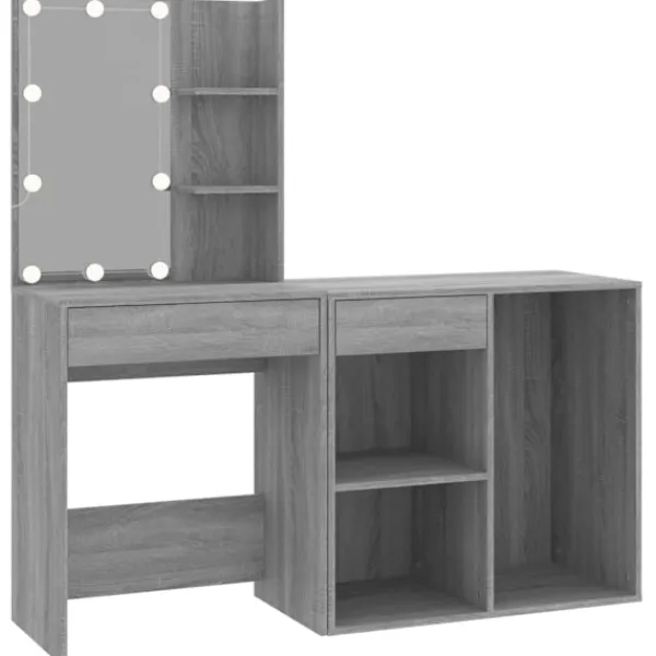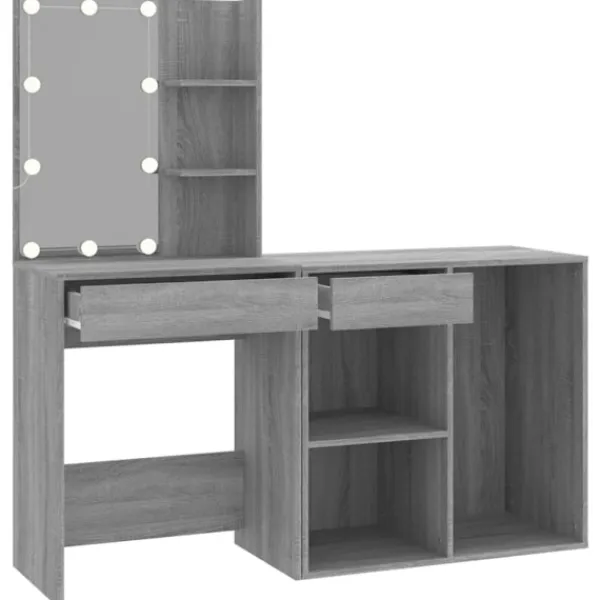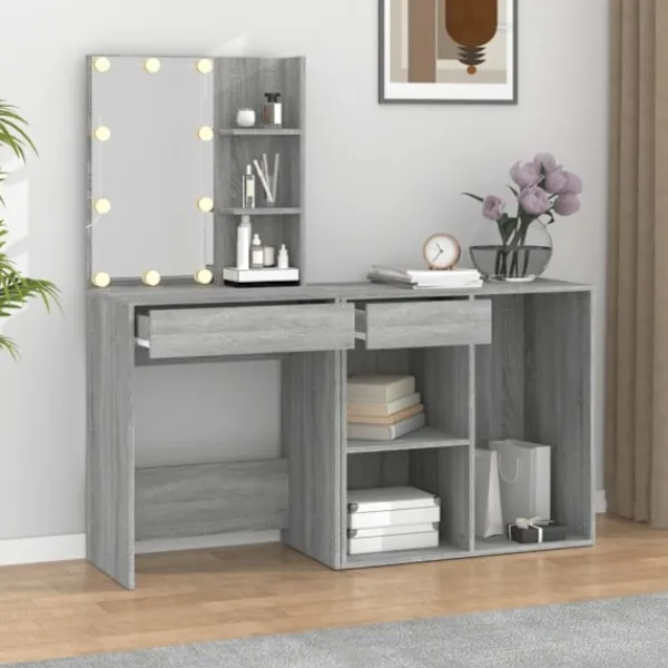 Detta trendiga sminkbord med LED ger ditt sovrum ett tidlöst, elegant utseende. Sminkbordet är ett utmärkt komplement till din sovrumsinredning samtidigt som du har din kosmetika nära till hands! Stabilt material: Det konstruerade träet är av exceptionell kvalitet med slät yta och är också starkt, stabilt och fuktbeständigt.Spegel: Sminkbordet med spegel är perfekt för din dagliga skönhetsrutin. Spegeln låter dig ta hand om din hud och den underlättar när du sminkar dig!LED-ljus: Sminkbordet med förvaring har också LED-lampor med USB, som är enkla att byta läge från varmt till kallvitt. LED-lamporna runt spegeln avger ljus.Gott om förvaringsutrymme: Sminkbordet med belysning har gott om utrymme för enkel åtkomst till smink, smycken och vardagliga nödvändigheter.Breda applikationer: Detta sminkbord är lämpligt för olika scener, till exempel ditt sovrum, garderob och alla andra rum du vill ställa det. VARNING:För att förhindra att den välter måste denna produkt användas med den medföljande monteringsanordningen för vägg Observera:Varje produkt levereras med en monteringsmanual i lådan för enkel montering.